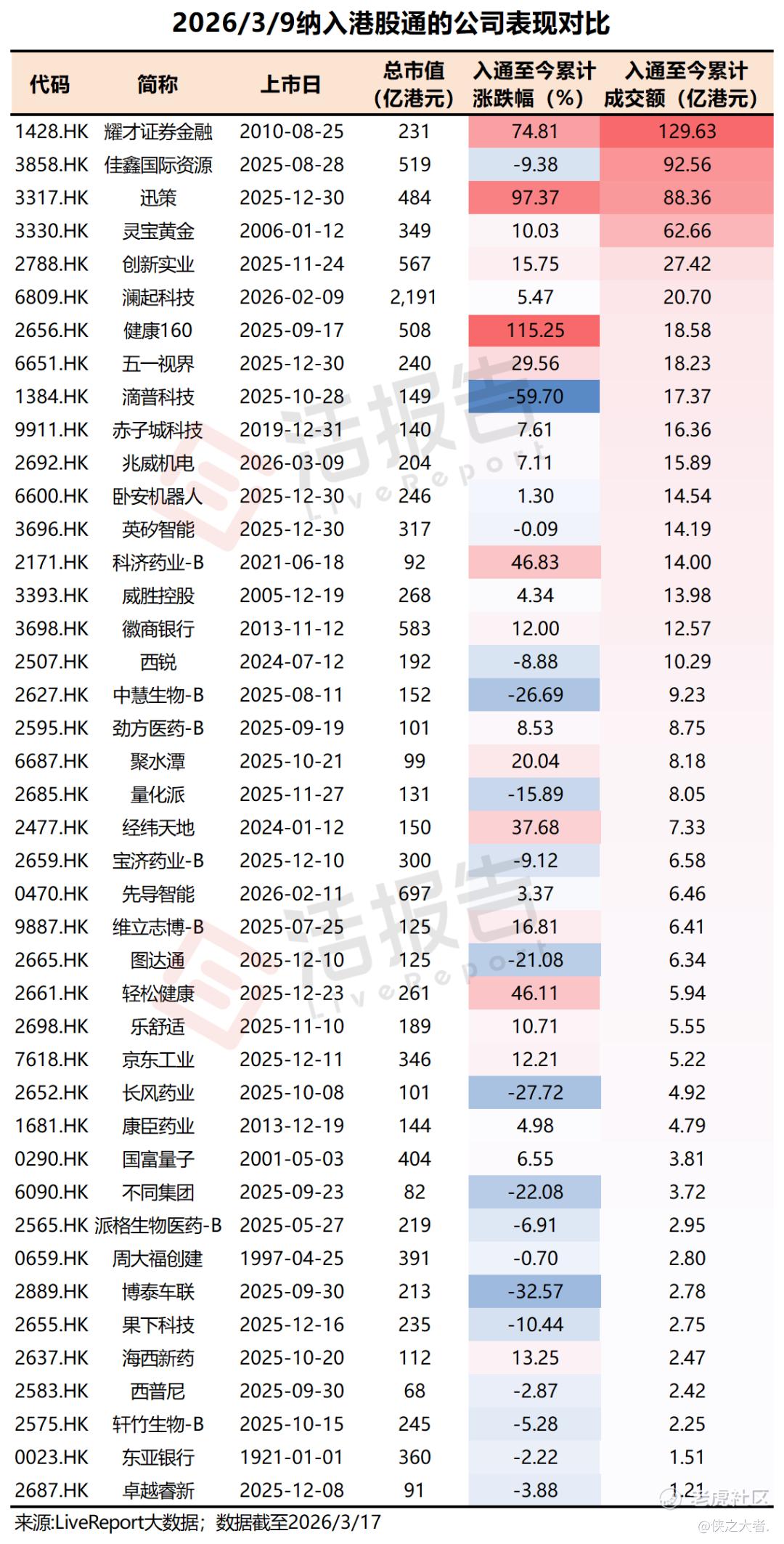 值得注意的是,2026年3月9日港股通可投资名单发生调整,新纳入42只股票,其中便包括耀才证券金融。据**大数据统计,截至3月17日,耀才证券金融成为这批入通股里成交额最大的一只股票。同时,自入通后其股价涨幅也达到了74.81%。