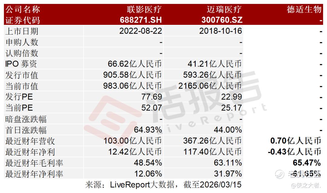 同行业IPO可比公司:联影医疗(688271.SH)、迈瑞医疗(300760.SZ)