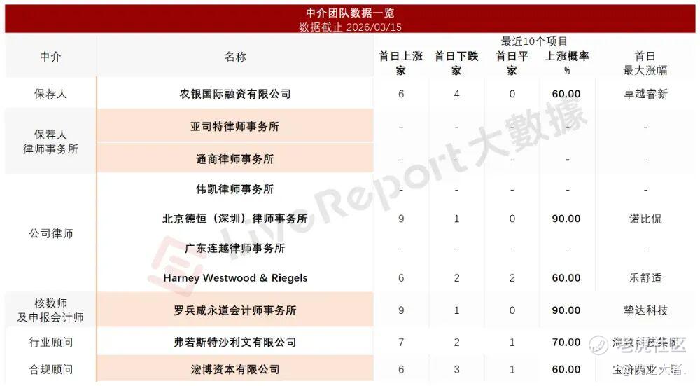 据**大数据统计,Hope Sea中介团队共计10家,其中保荐人1家,近10家保荐项目数据表现平平;公司律师共计4家,综合项目数据表现不一。整体而言中介团队历史数据表现一般。
