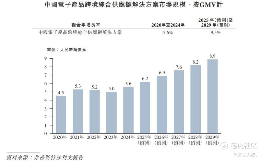 根据弗若斯特沙利文(Frost & Sullivan)的报告,中国电子产品跨境综合供应链解决方案市场的GMV从2020年的人民币4.5万亿元增长至2024年的人民币5.6万亿元,复合年增长率达5.6%。