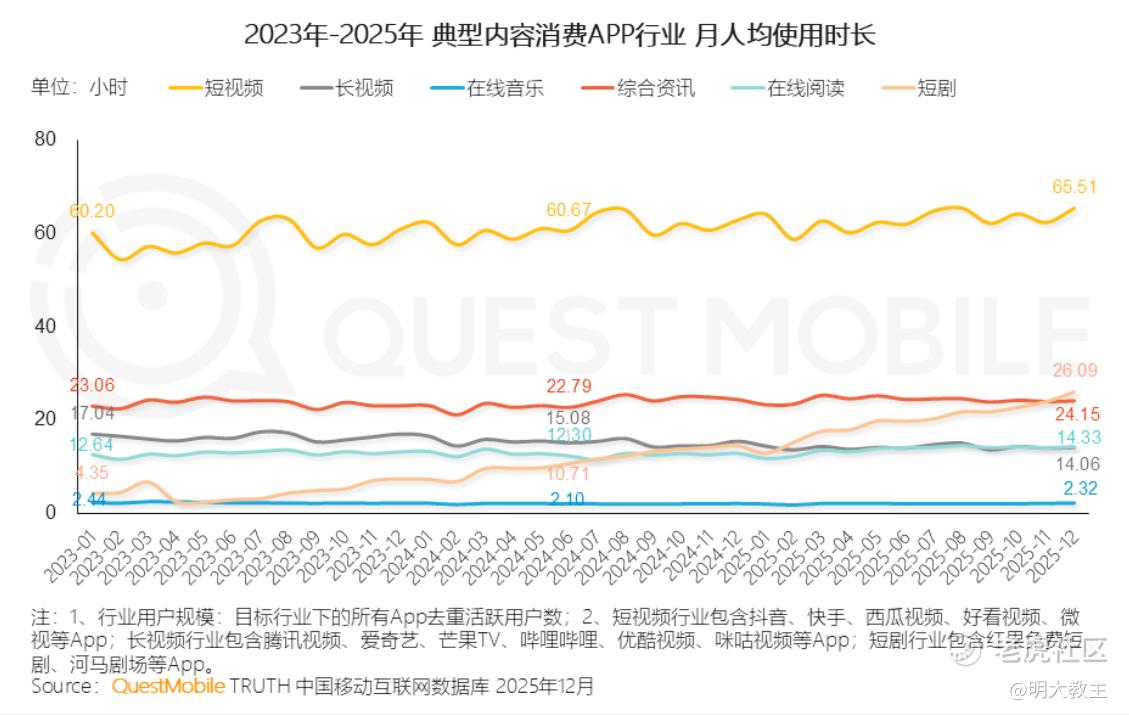 短剧用户月均使用时长从2023年初的4.35小时/月增长至26.09小时/月。