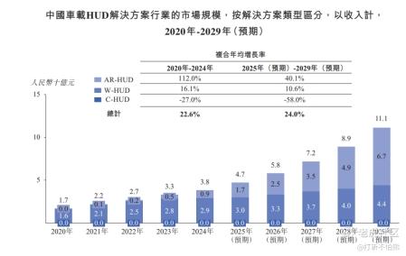 泽景股份的核心赛道是车载HUD,目前市面上主流的HUD分为三类:W-HUD、C-HUD、AR-HUD。其中,AR-HUD是妥妥的潜力赛道,根据招股书数据,中国AR-HUD市场规模年化增长率高达112%,而W-HUD增速逐渐放缓,C-HUD已经慢慢被市场淘汰,这也是泽景股份最大的看点。