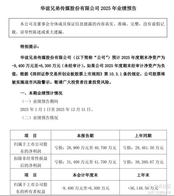 比持续亏损更致命的,是退市风险!3月13日,华谊兄弟发布第二次退市风险警示公告,初步测算2025年期末净资产在-9400万元至+6300万元之间(未经审计),刚好悬在“正负生死线”上。