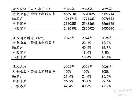 这些“新付费者”的加入,在财报数据里留下了清晰的痕迹。2025年全年,BOSS直聘KA、中型、小型三类客户贡献的收入全部实现增长,小型客户(年付费5000元及以下)收入占比从2024年的40.6%进一步提升至42.2%——这批小型客户,不难猜测很多就是刚刚触网的蓝领行业老板和县城小店主。与此同时,KA大客户(年付费5万元及以上)的收入占比也在提升。都说“船大难掉头”,连相对保守的大企业都开始加码招聘预算了,这个指标可以看作经济复苏的又一信号。