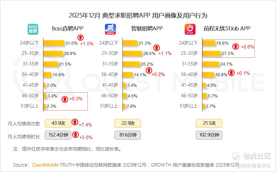 换句话说,这是“深度使用”而非“随便看看”。更关键的是,同样的宏观环境下,BOSS直聘的增长也超过其他招聘平台——大盘影响很重要,但产品力才是决定性因素。