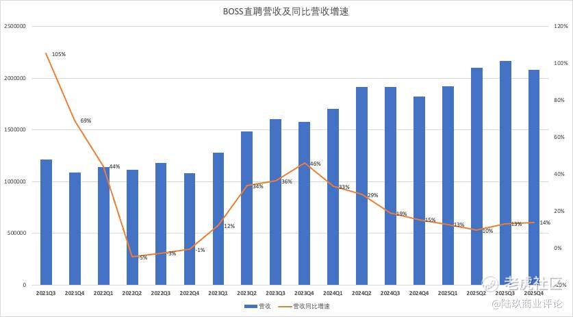 人声鼎沸间,3月18日美股盘前,BOSS直聘 $BOSS直聘(BZ)$ 发布了2025年第四季度及全年财报,业绩稳健增长。数据显示,2025年第四季度平台营收20.8亿元,同比上涨14%;2025年全年营收82.7亿元,同比上涨12.4%。