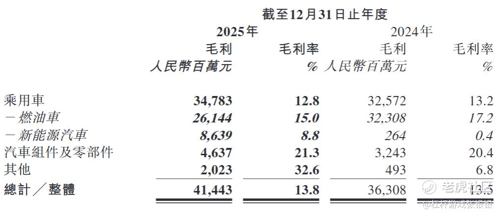 不过杠杆游戏注意到,尽管新能源汽车增长明显,但现阶段盈利短板依然突出:2025年该业务毛利86.39亿元,毛利率约8.8%,同期燃油车毛利261.44亿元,毛利率15%。