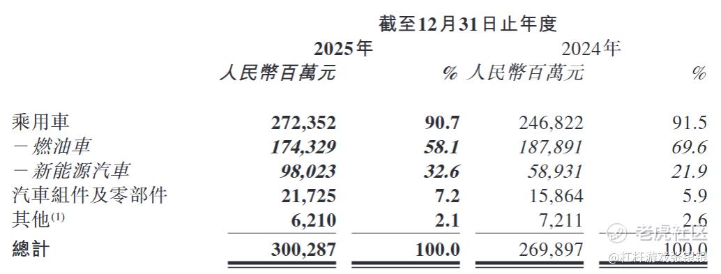 其中燃油车收入1743.29亿元,占比58.1%,新能源汽车收入980.23亿元,占比32.6%。