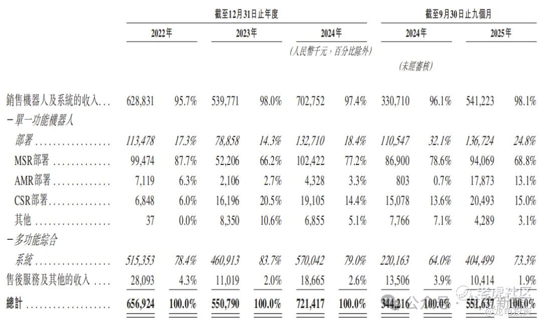 主要营收来源于机器人及系统和售后服务,2022年至2024年机器人及系统营收分别为:6.28亿、5.39亿、7.02亿,占比分别为:95.7%、98%、97.4%;售后服务占比2.6%左右,就不罗列了,具体看下图。
