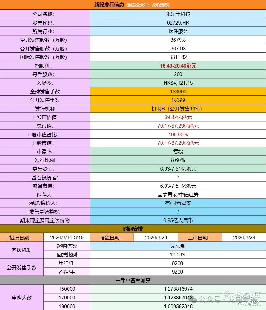 凯乐士科技全球发售股数3679.8万股,每手股数200股,招股价16.40-20.40港元,入场费4121.15港元,采用机制B发行,公开发售手数18399手,预计15-19万人参与,一手中签率1%左右,全员抽签。