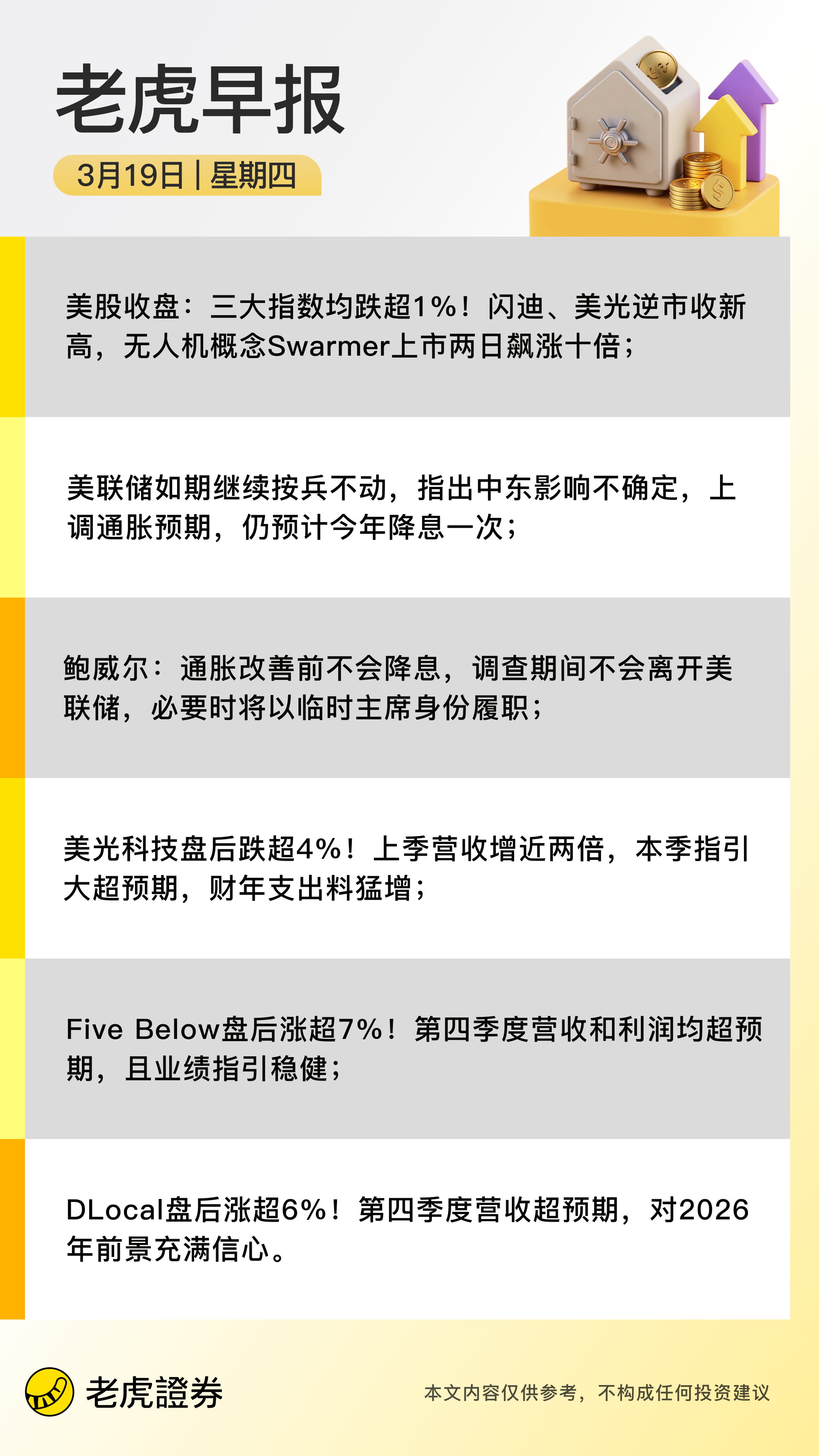 3月19日,美股三大指数集体收跌,截至收盘,道琼斯跌1.63%,报46225.15点;标普500跌1.36%,报6624.70点;纳斯达克跌1.46%,报22152.42点。交易集中于大型科技与AI链,部分个股因基本面与公司消息出现显著波动。