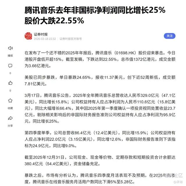 一面是业绩超预期,一面是AI的潜在威胁。在腾讯发布财报的前一天,腾讯音乐股价发布了一份还不错的财报但股价暴跌。