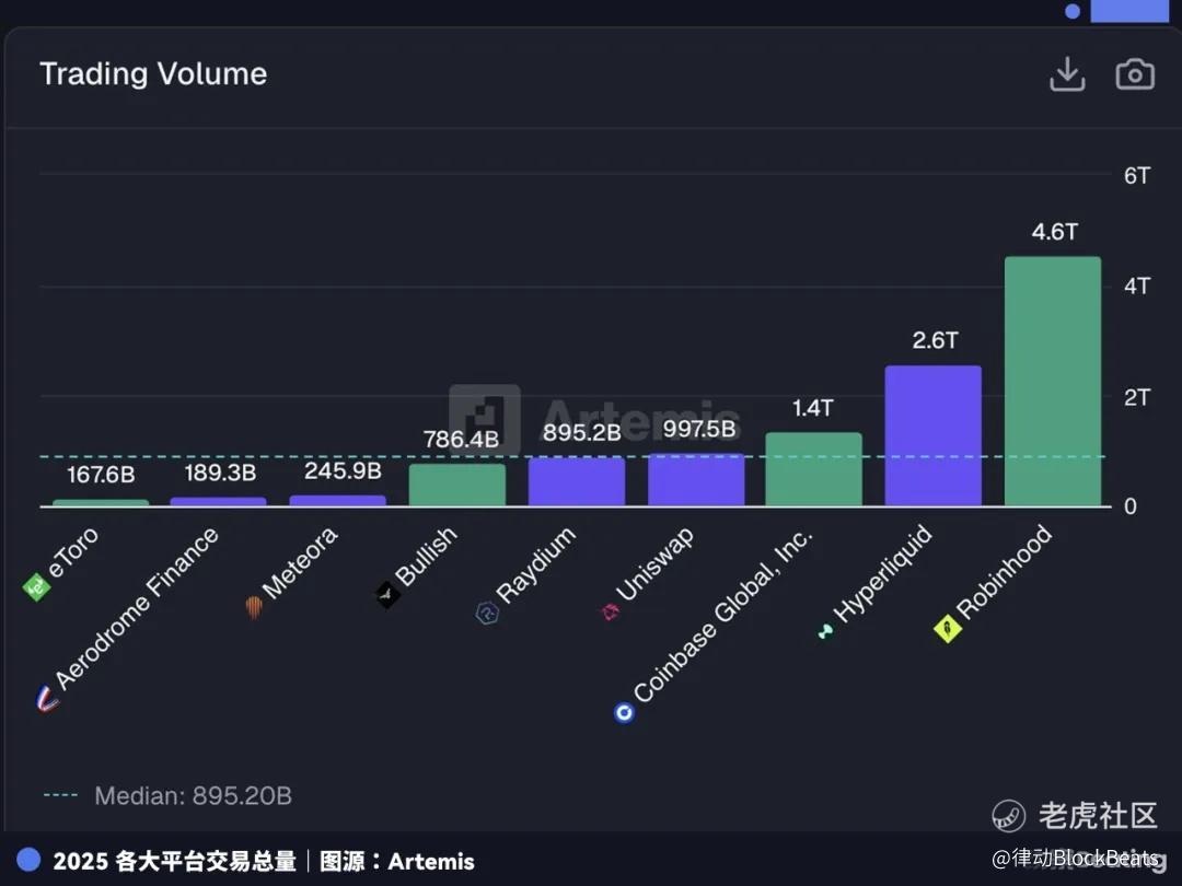 作为参照,Coinbase 同期交易量约为 1.4 万亿美元。一个没有公司实体、没有 CEO 公开露面的链上协议,交易量是纳斯达克上市公司 Coinbase 的两倍。