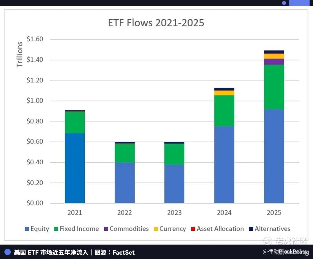 截至 2025 年 3 月,美国被动基金(含共同基金和 ETF)管理资产规模达到 15.96 万亿美元,占全部共同基金行业资产的 51%,首次超过主动管理基金。2025 年全年,美国 ETF 市场净流入 1.49 万亿美元,创历史纪录,其中权益类 ETF 吸纳了 9230 亿美元。
