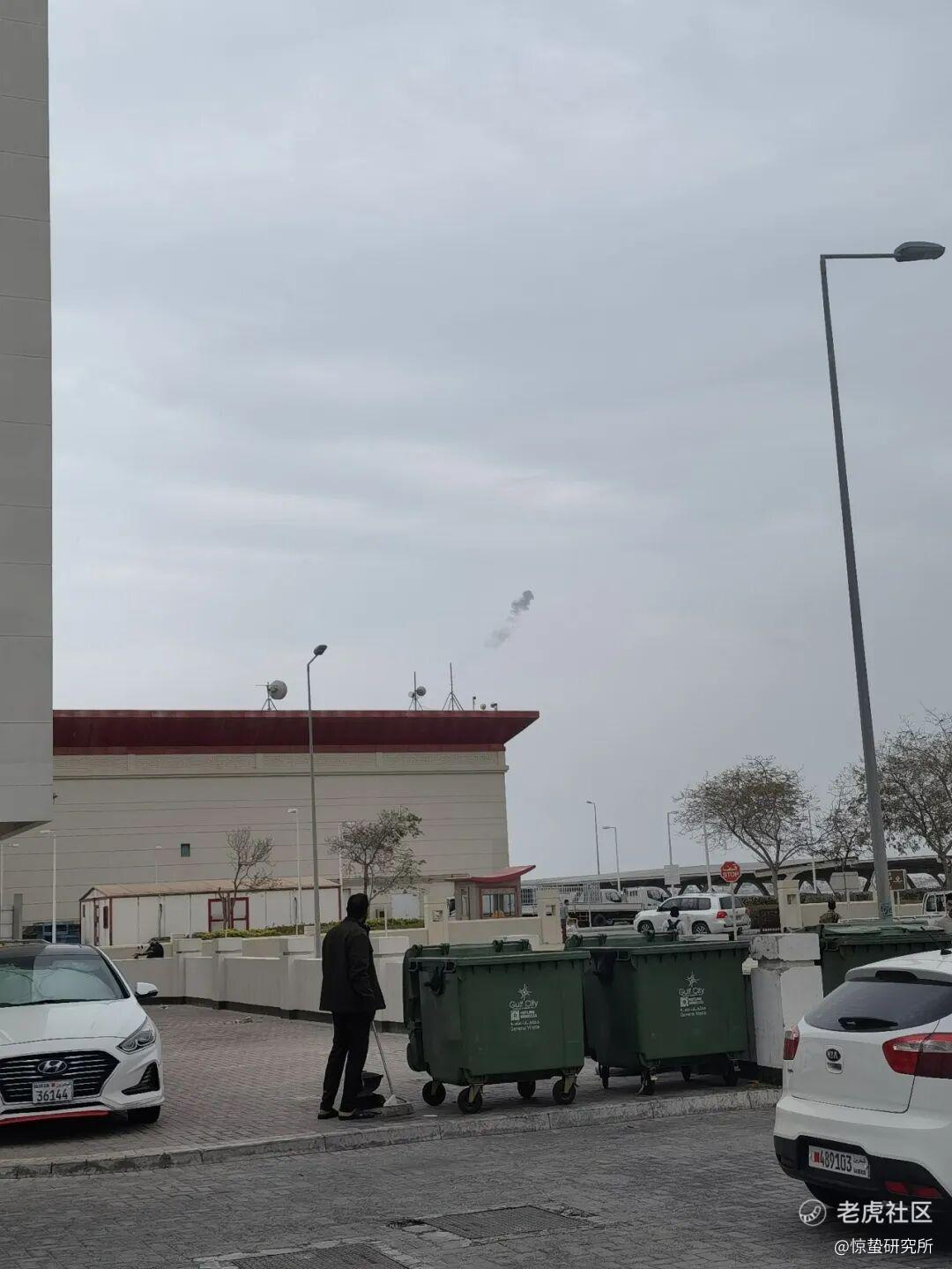 *公寓的工作人员抬头看导弹被拦截后产生的烟雾(受访者提供)