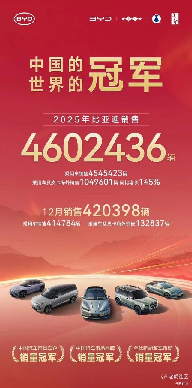 2025年,比亚迪全年销量达460万辆。其中纯电车型225万辆,以超60万辆的优势,首次在年度维度上超越特斯拉,登顶新能源汽车全球第一。