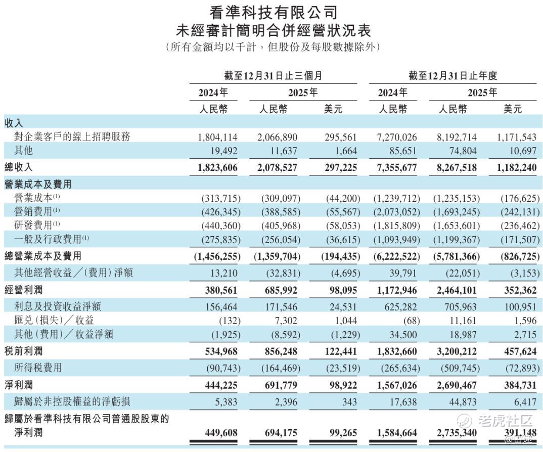 BOSS直聘2025年第四季度的经调整净利润为9.06亿元(1.3亿美元),较2024年同季度的7.22亿元增加25.4%。
