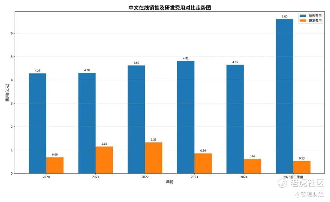 而与之形成鲜明对比的是,其研发投入捉襟见肘。数据显示,中文在线的研发费用由2022年的1.33亿元高位逐年降至2024年的仅0.62亿元,占总营收比重由11.27%降至5.35%。2025年前三季度更是只有0.53亿元,不足销售费用的十二分之一。