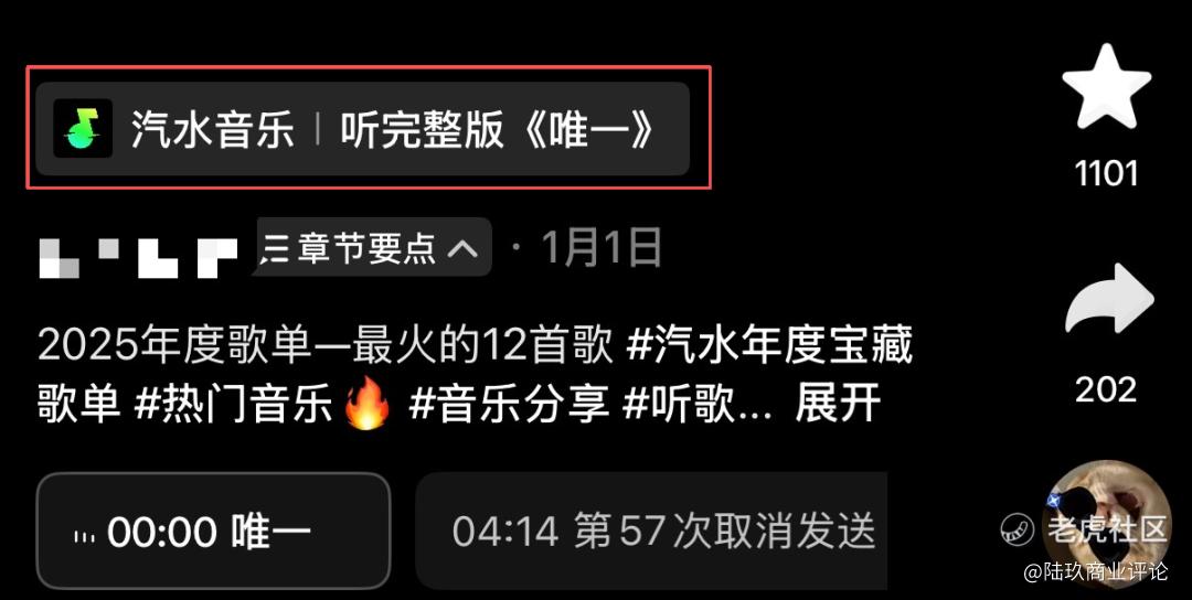 陆玖商业评论认为,一个典型的用户场景是:在抖音刷到一首歌的片段→直接收藏到抖音内建歌单→下次想听时,第一反应是打开抖音而不是QQ音乐。“听歌+刷视频”在同一个APP里完成闭环,传统音乐APP正在被边缘化为“纯工具”,当然了,车载场景还算稳固,但手机端这块蛋糕,已被切走了可观的一块。