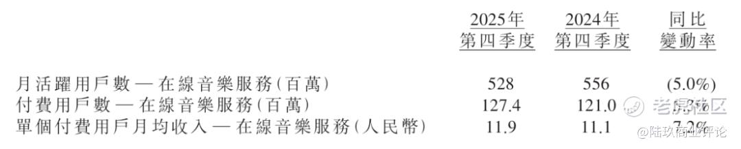 陆玖商业评论注意到,更耐人寻味的是,2026年开始,腾讯音乐将不再披露在线音乐MAU、付费用户数和ARPPU季度数据。