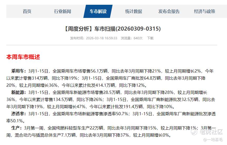 乘联分会公布数据显示,3月1-15日,全国乘用车市场零售56.1万辆,同比去年3月同期下降21%,较上月同期增长2%,今年以来累计零售314万辆,同比下降19%;3月1-15日,全国乘用车厂商批发64.8万辆,同比去年3月同期下降20%,较上月同期增长36%,今年以来累计批发414.1万辆,同比下降12%。