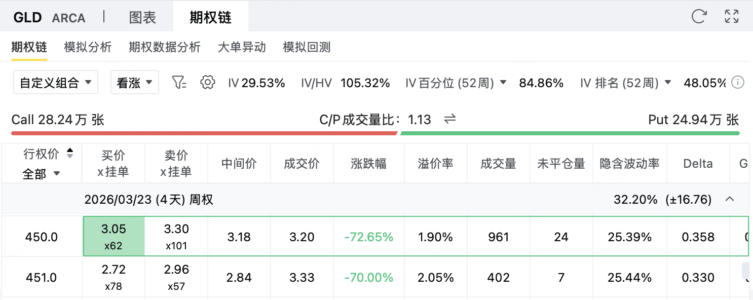 策略的胜率依赖于“价格守住450上方压力、至少不有效突破451.40”的判断;若后续地缘风险进一步升级、美元快速走弱,或市场重新强化黄金避险交易,GLD快速上破压力区间,组合亏损将扩大,但最大亏损已在建仓时封顶。