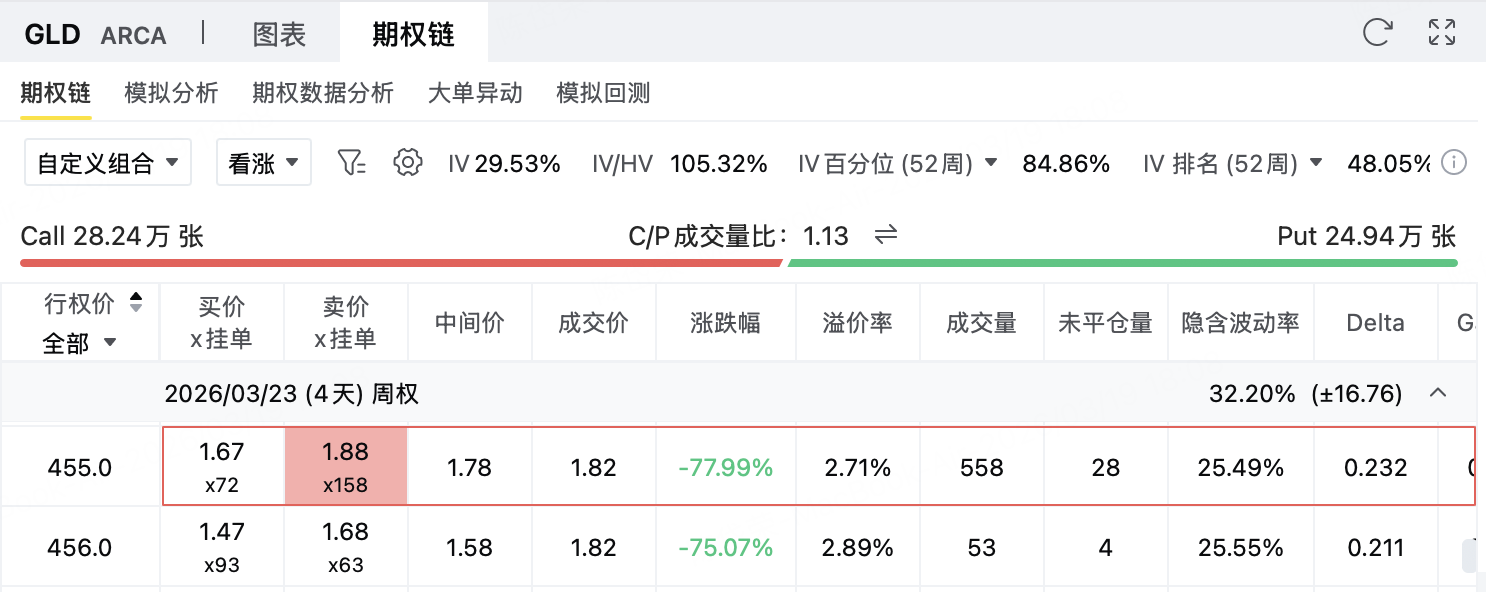 投资者在GLD(SPDR Gold Shares)期权上构建一个熊市看涨价差(Bear Call Spread)策略。该策略属于收取权利金、有限收益、有限风险的偏空 / 震荡策略,适合判断GLD在到期前难以有效突破上方压力区域、维持震荡或小幅回落的情形。
