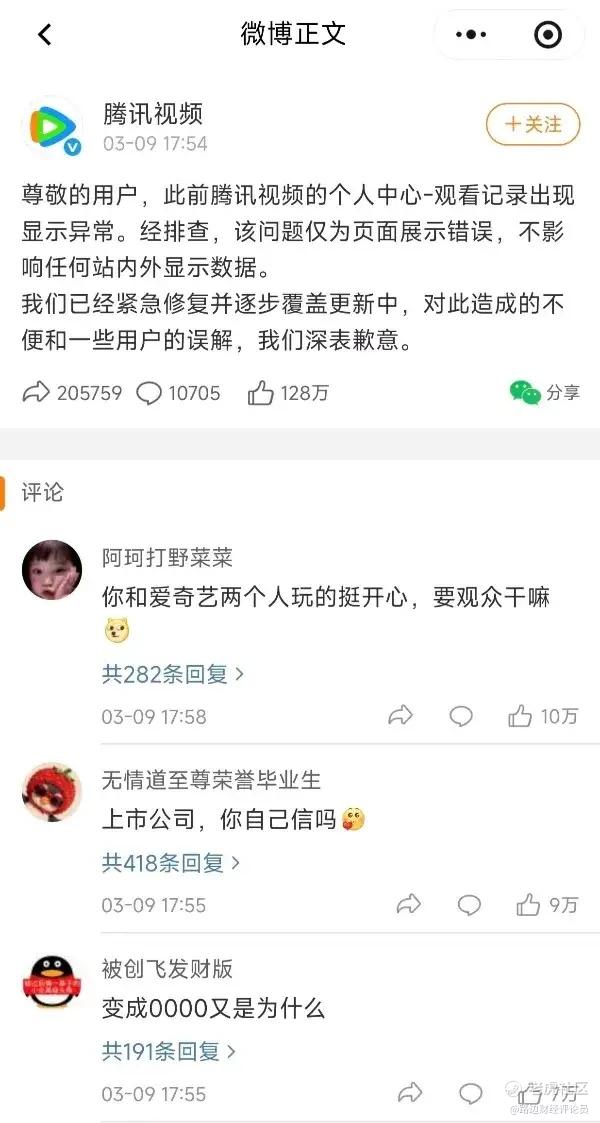 争议的引爆点出现在3月9日,有网友发现腾讯视频出现技术“Bug”,非会员用户点击播放页1-2秒后退出,观看记录竟显示“已看完该集”。这一事件迅速将“逐玉数据造假”、“手搓热度”等词条推上热搜榜首,尽管事后腾讯视频迅速致歉,解释称问题仅为“页面展示错误”且不影响实际数据统计,但公众的信任裂痕已然产生。在爱奇艺“热度破万”的官方喜报下,热评第一却是“纯添加、纯兑水”,这种尴尬的局面,恰恰暴露了“人造爆款”的虚假性。
