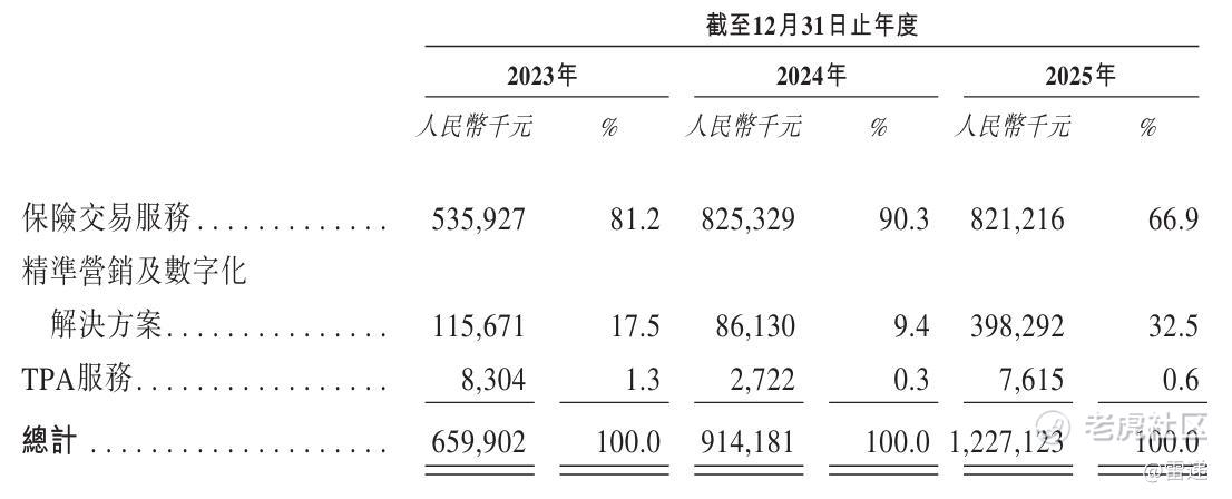 白鸽在线2025年保险交易服务收入为8.21亿元,占比为66.9%;来自精准营销及数字化解决方案收入为3.98亿元,占比为32.5%;来自TPA服务收入为761.5万元,占比为0.6%。