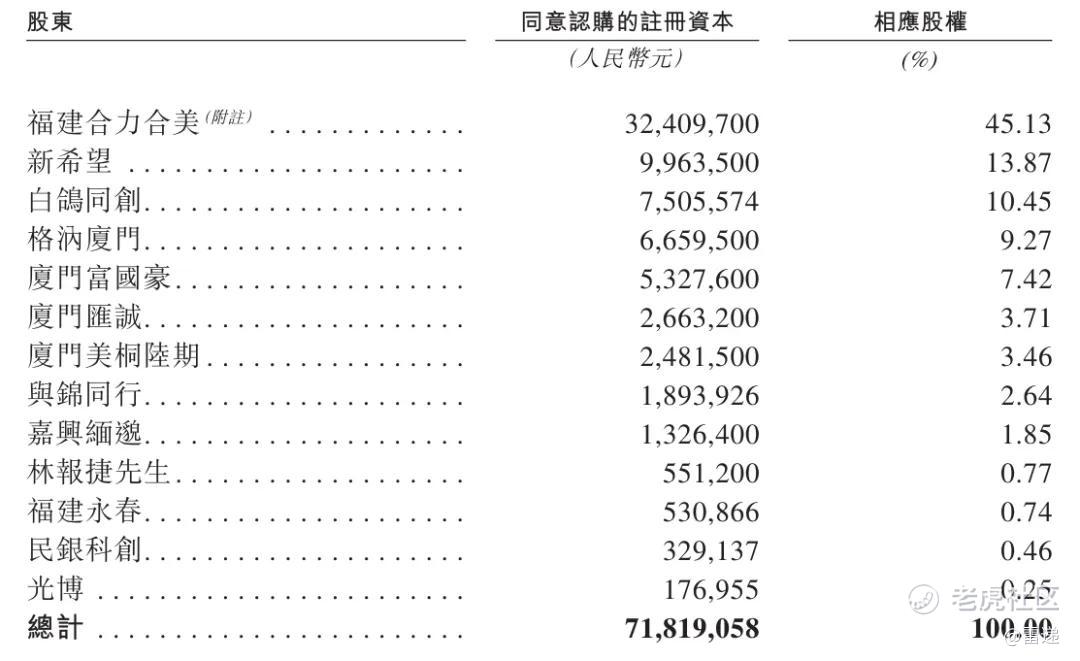 IPO前,福建合力合美持股为45.13%,新希望持股为13.87%,白鸽同创持股为10.45%,格汭厦门持股为9.27%,厦门富国豪持股为7.42%,厦门汇诚持股为3.71%,厦门美桐陆期持股为3.46%;