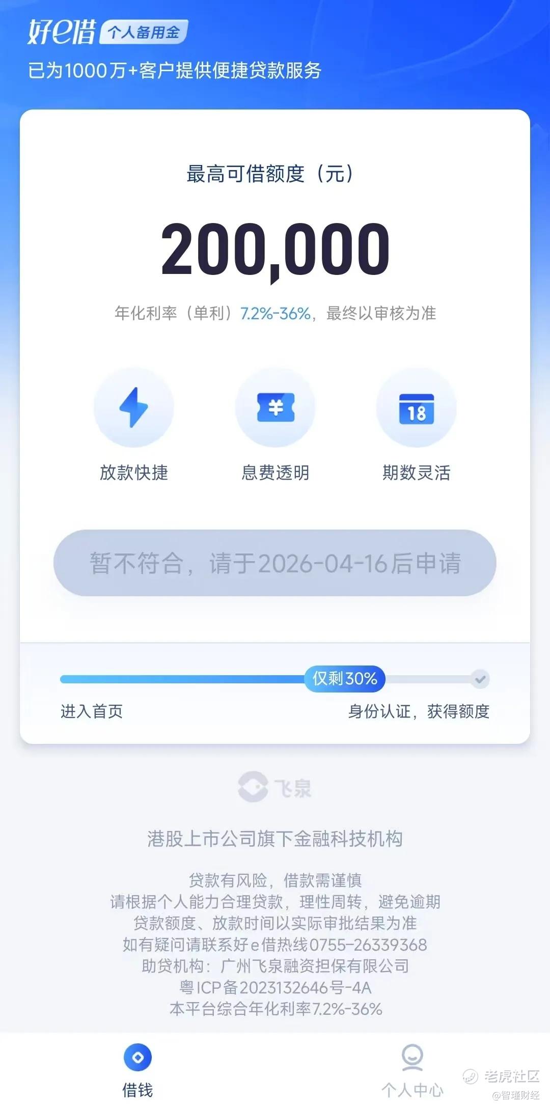 3月17日,开甲财经小编尝试在“好e借”申请借款,在上传身份证、人脸识别后,页面提示:“资料提交成功,即将获得授信额度”不到1分钟,页面显示:“暂不符合,请于2026年4月16日后申请”。值得注意的是,小编尝试申请借款前后,好e借APP页面均显示:年化利率均为7.2%-36%。
