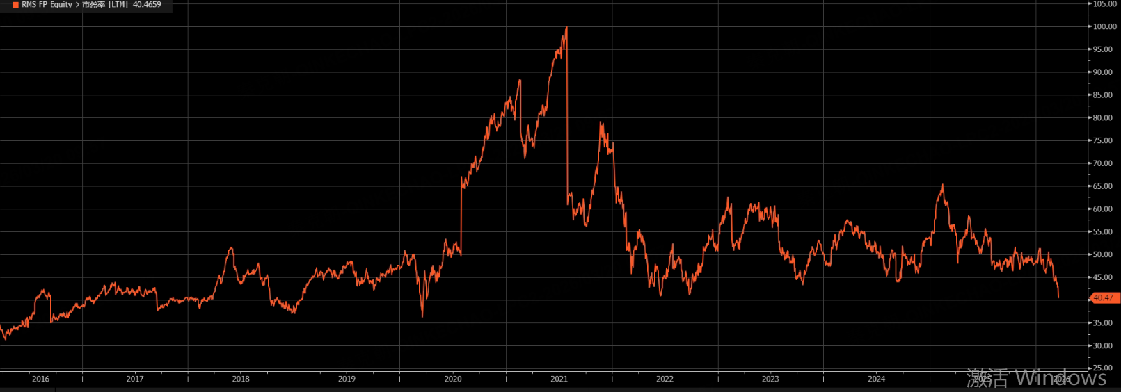 最关键的是,爱马仕经过大幅回调后,此前高估值情况已有所回落,最新市盈率降至40倍,位于近10年来较低的位置: