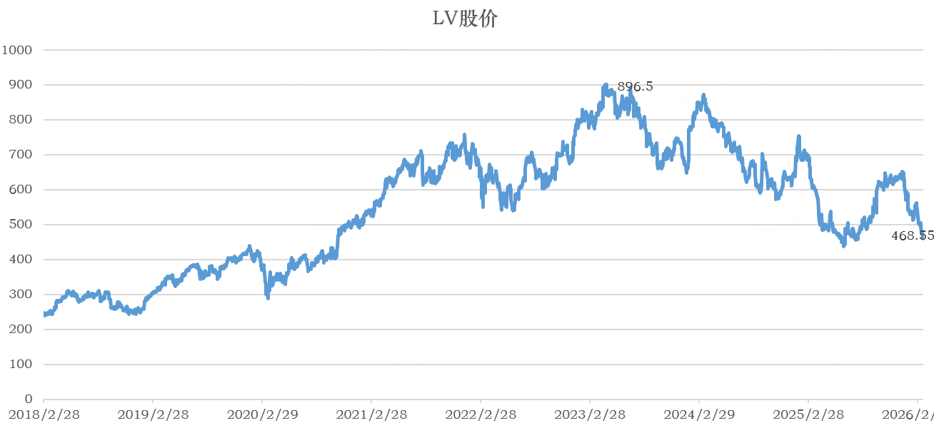 LV跌幅虽然不大,仅1.77%,但已跌至近年来低点,且已较历史最高点接近腰斩! $LVMH-Moet Hennessy Louis Vuitton(LVMHF)$