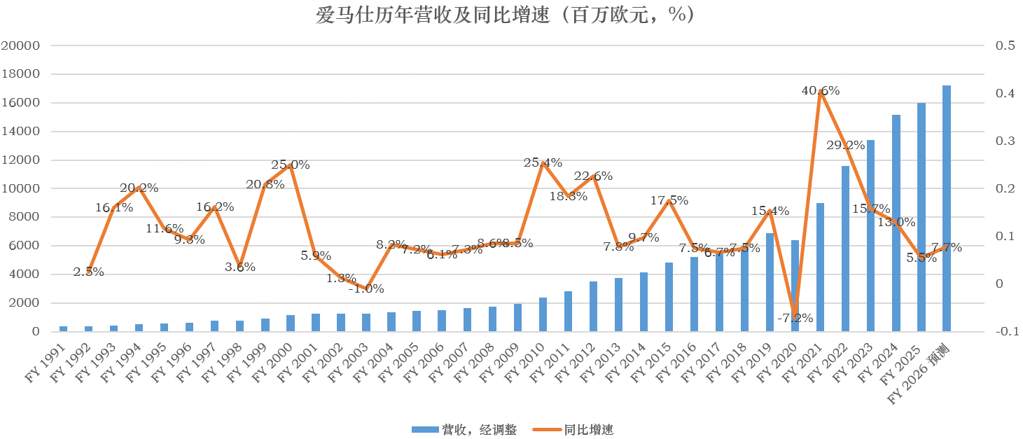 从历史上看,爱马仕年营收仅在2003年和2020年出现下滑,其余年份皆保持了正增长: