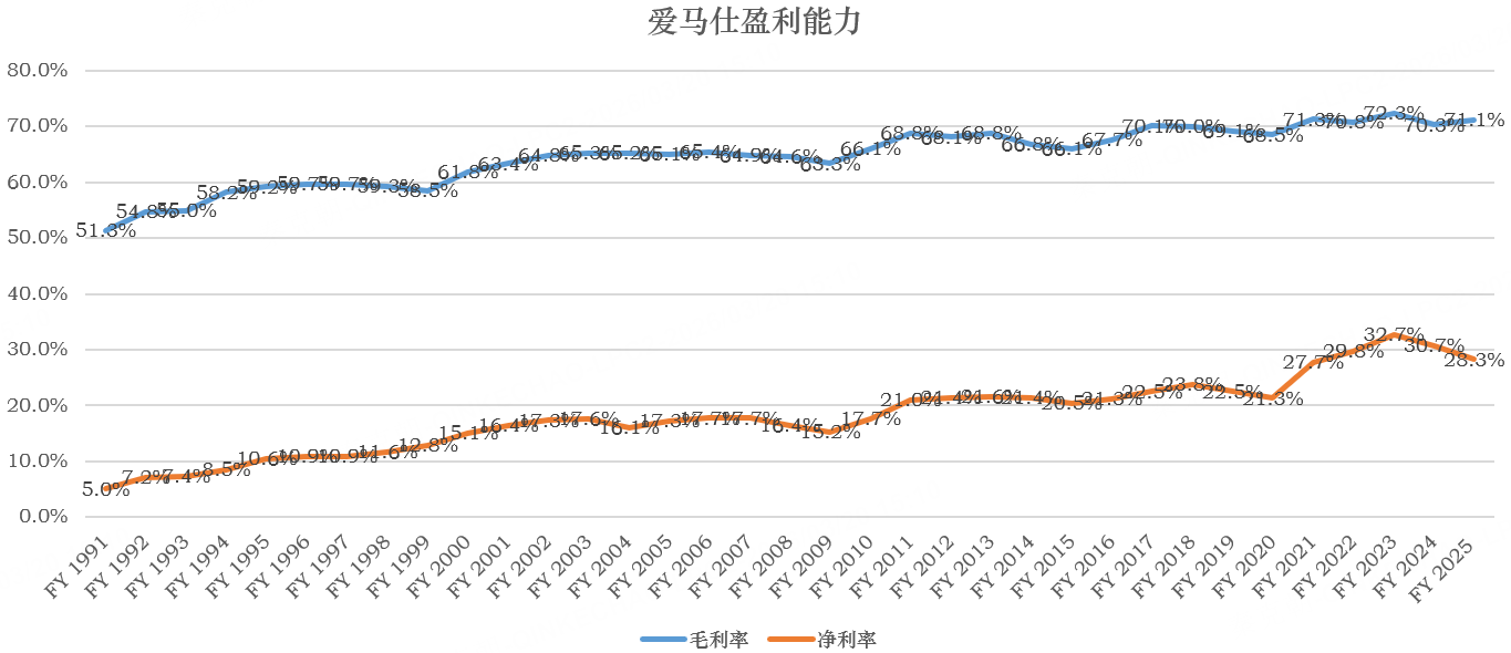 也因此,爱马仕能维持超高的盈利能力,2025年的毛利率71.1%,营业利润率高达41%,如果不是去年法国征收大型企业特别利润税,爱马仕的净利率仍将超过30%: