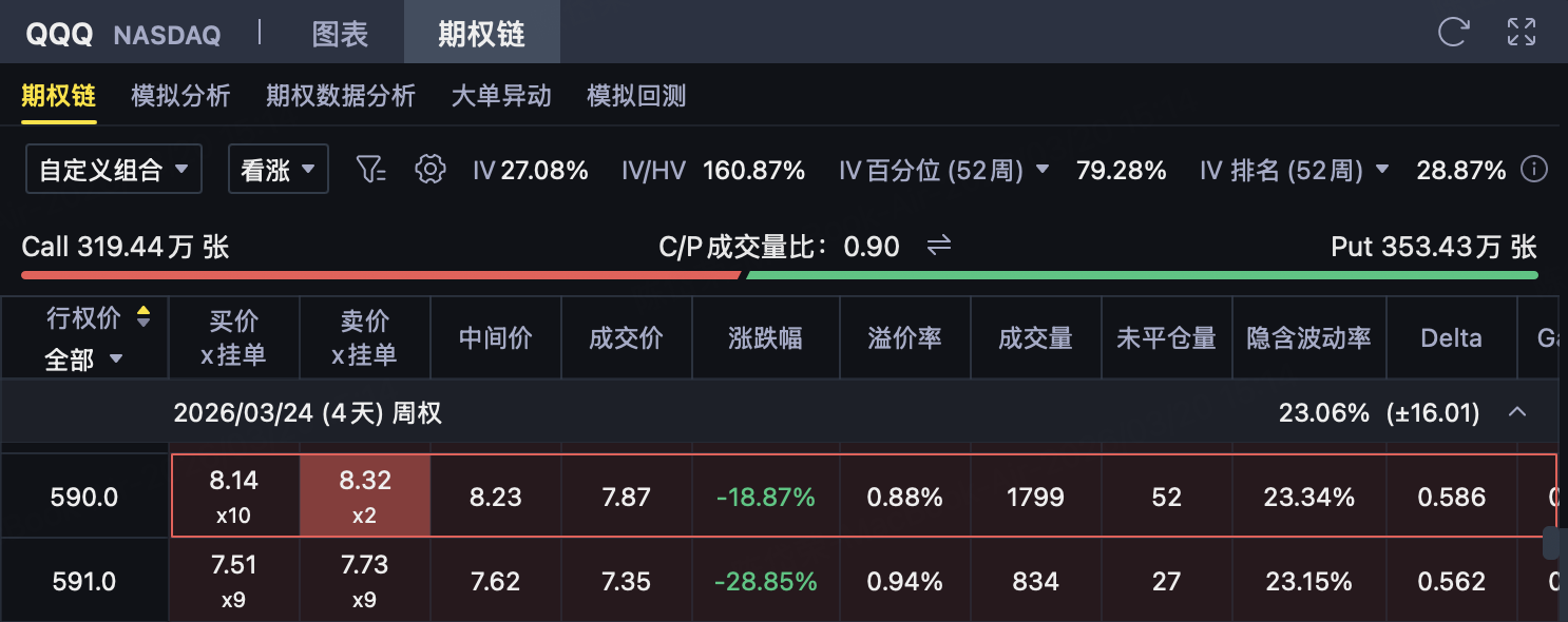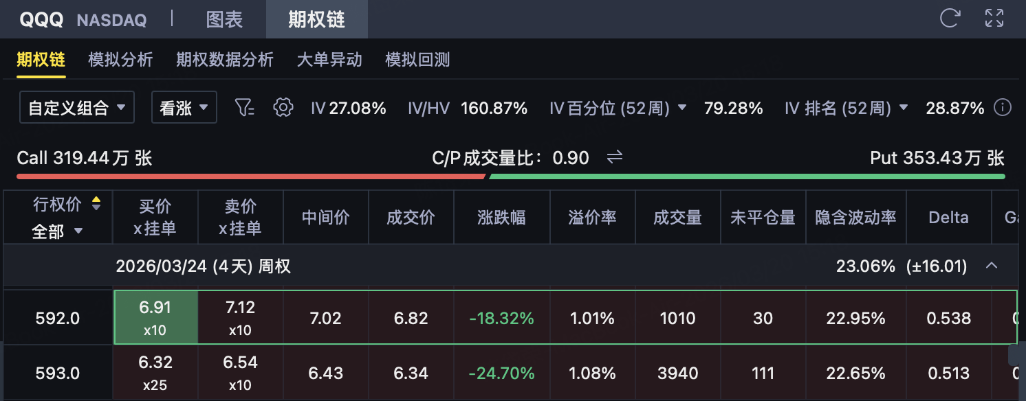 在这种背景下,如果判断QQQ到期前大概率能够守住当前附近支撑、但上行空间相对有限,则可考虑构建牛市看涨价差策略,用较低成本参与一次短线反弹,同时将潜在风险和收益提前锁定。