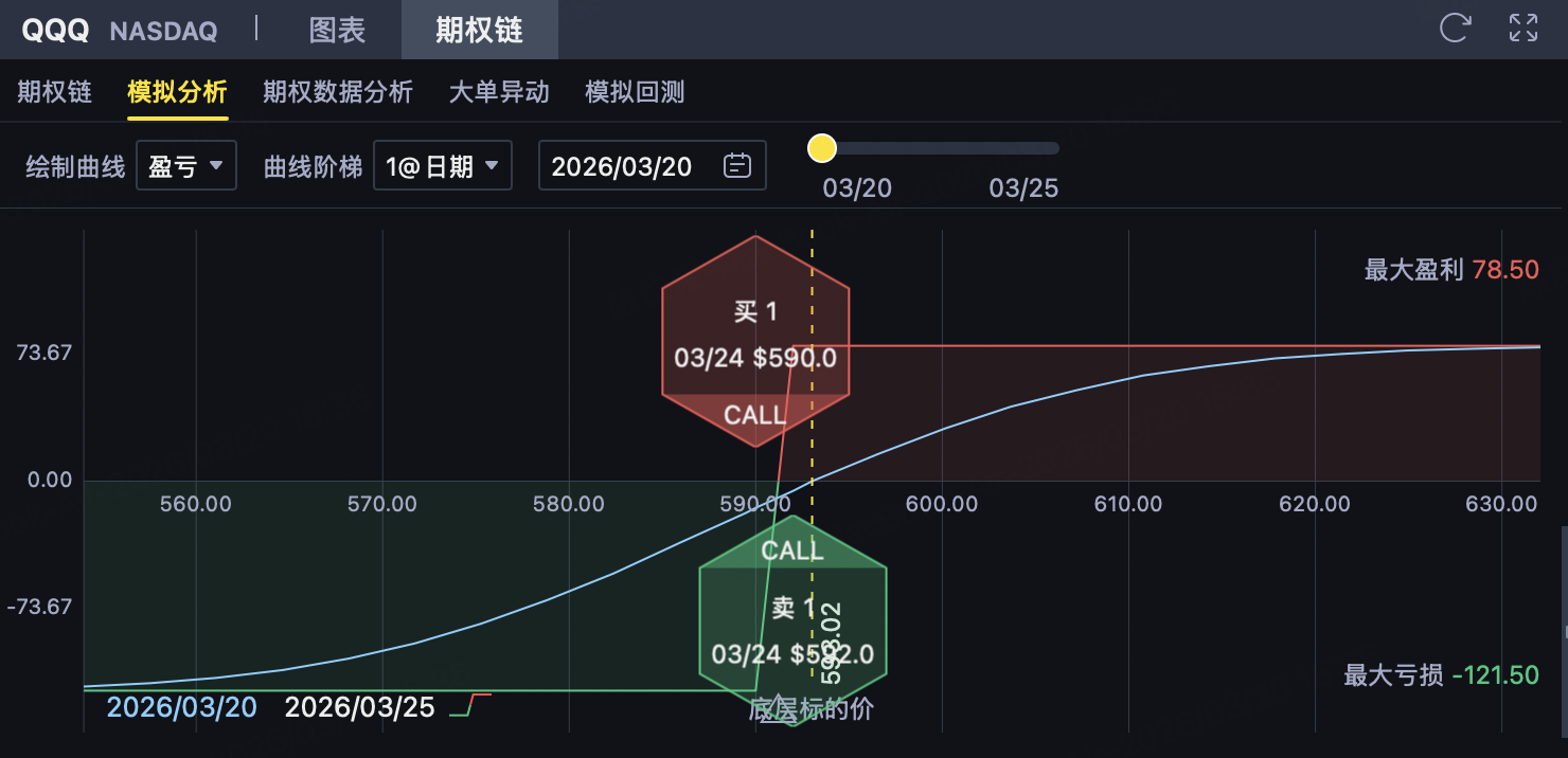 投资者在 $纳指100ETF(QQQ)$ 期权上构建一个牛市看涨价差(Bull Call Spread)策略。该策略属于支付权利金、有限收益、有限风险的偏多策略,适合判断QQQ在到期前有望小幅反弹,但上涨空间可能受限的情形。