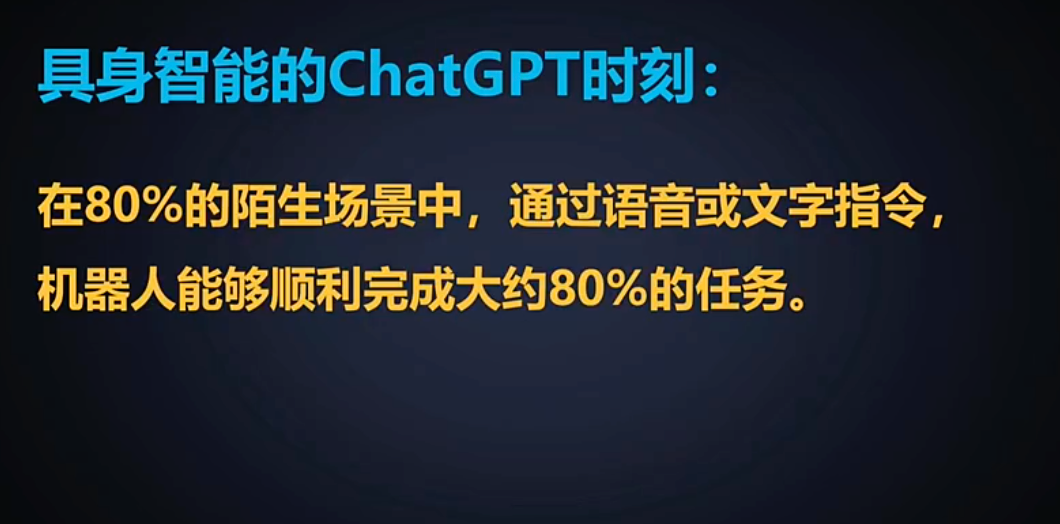 39、如果未来哪天,一台机器人到80%左右的陌生环境,给它发一个语音或者指令,它能实现80%左右的任务,我觉得就差不多达到了一个具身智能或者机器人的ChatGPT时刻,这非常重要。