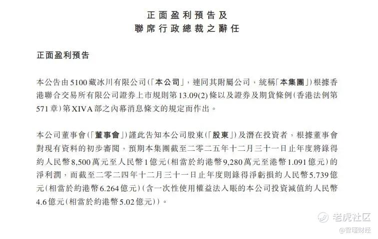 近日,5100藏冰川发布公告显示,公司2025年将录得约人民币8500万元至人民币1亿元(相当于约港币9280万元至港币1.091亿元)的净利润。这也表示,公司在连续亏损3年后,实现了扭亏为盈。