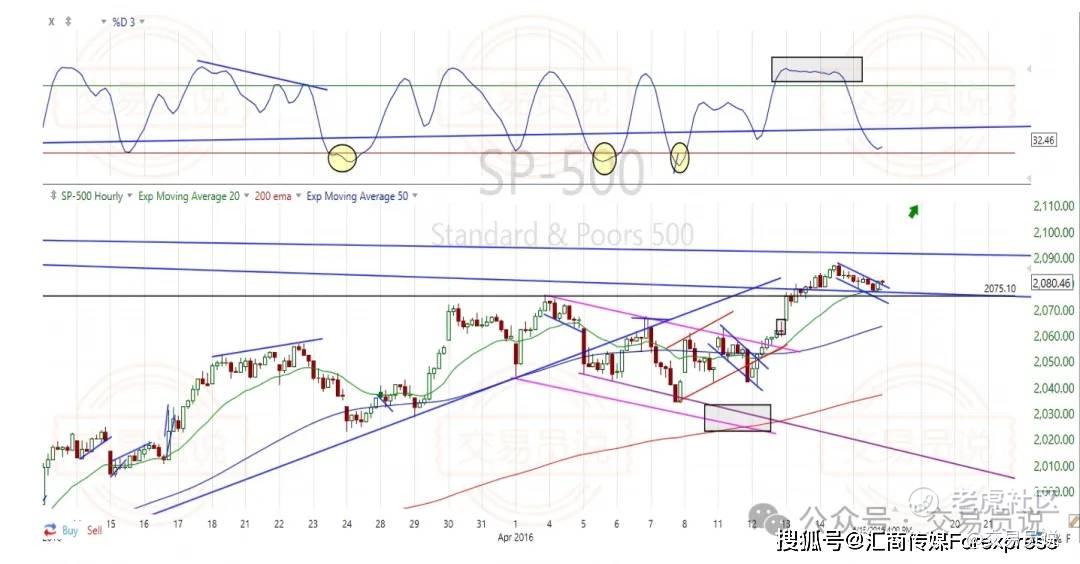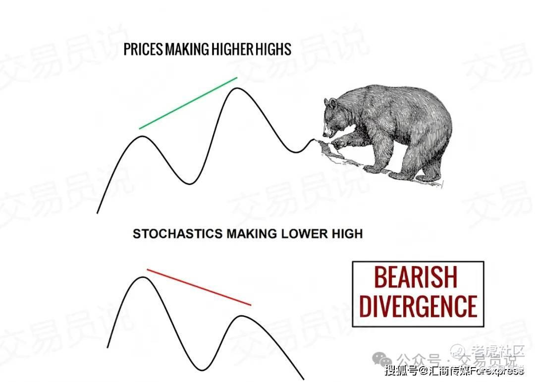 价格创出更高高点(HH),但随机指标却形成更低高点=卖方动能背离,是高概率做空入场信号。