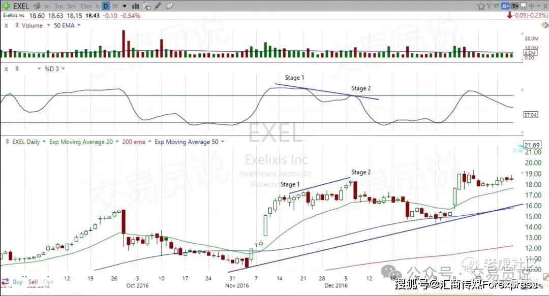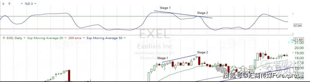 背离的阶段#1中,随机指标应位于80线上方(超买区域)。随后价格从该高点回落,使随机指标重新回到80线下方。