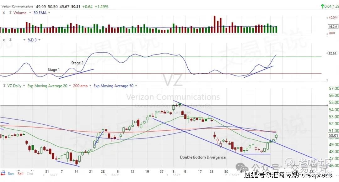 阶段#2:你希望看到价格快速下跌至前低点以下,或者至少形成双底。同时,随机指标保持在20线以上,然后回升,在随机指标上形成更高的低点。