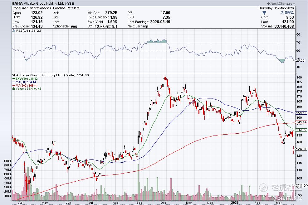 财报公布后,BABA股价单日重挫7.09%,创下自去年10月以来最大跌幅,收于124.90美元,市场情绪明显转冷。
