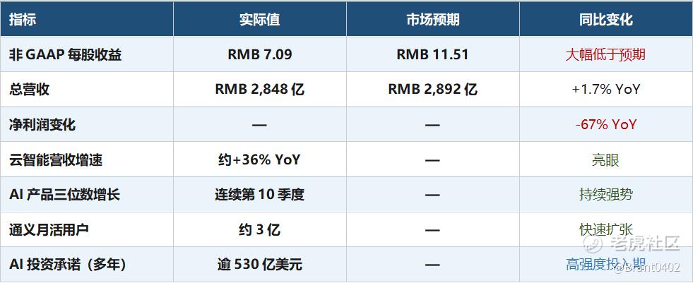 周四, $阿里巴巴(BABA)$ 刚刚公布了Q3财报。在万众瞩目的AI转型关键期,这份财报未能如期展示出AI业务的强劲增长足以抵消核心业务的疲软。最令市场震惊的莫过于,非美国通用会计准则(Non-GAAP)净利润同比骤降67%,这一数据不仅远低于市场预期,更凸显了其在残酷的电商竞争和高昂的AI投入双重夹击下,利润空间正面临前所未有的挤压。