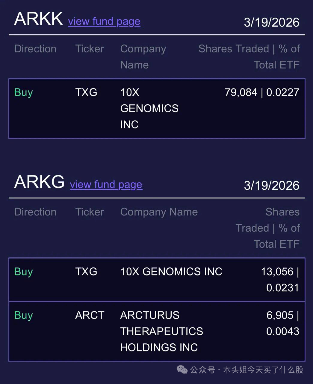 木头姐买入170万美元TXG、4.6万美元ARCT。这两天木头姐没怎么买卖,留着钱憋大招吗?