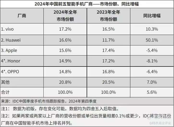 仅一年后的2025年,此番格局再次发生反转。去年,苹果逆势增长,vivo结束此前高光时刻,荣耀三季度回归前五,但全年看,荣耀从2024年的第四名代替了小米,沦为IDC榜单上的others,小米成为第四名,而**冲上榜首登顶国内第一。