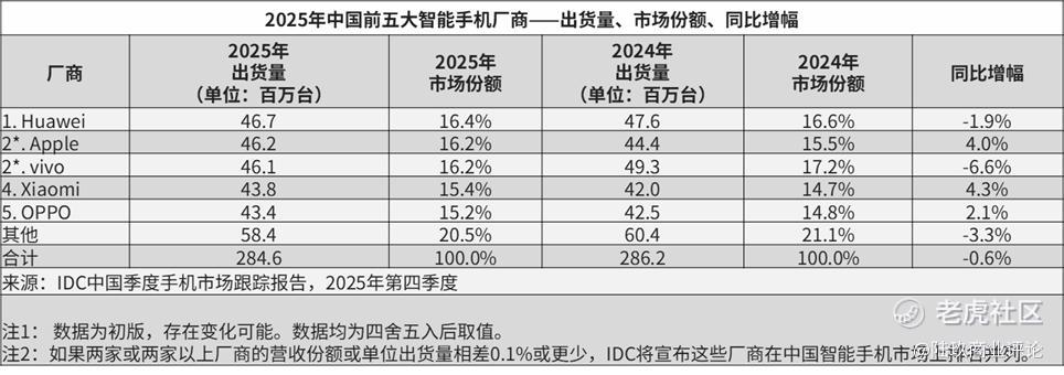 可是,产品端的市场分层特征早就已经越来越明显,4000元以上的高端市场,**和苹果依托于多年前在系统、自主芯片等方面建立起来的护城河以及品牌心智,一直合计占据了行业近八成份额,形成了难以撼动的双寡头格局。况且,苹果在2025年出货量大涨4%,成为中国市场上涨排名第二的厂商,对其他厂商带来的压力愈发明显。