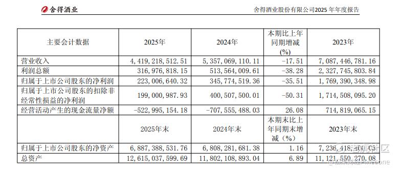 舍得酒业正处在这场巨变的中心。其日前发布的业绩报告显示,2025年,公司实现营业收入44.19亿元,同比下降17.51%;归母净利润2.23亿元,同比下降35.51%。