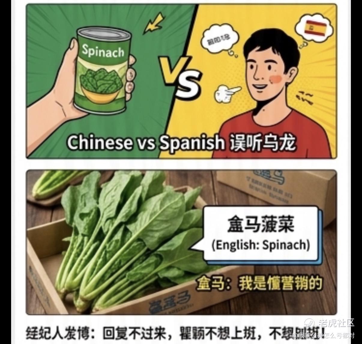 这期节目点赞近100万,瞿颖的视频账号几天涨粉9万+,各大平台全是她的搞笑切片,连盒马都趁机蹭热度,在菠菜产品上加上英文标签,完成一波精准营销。