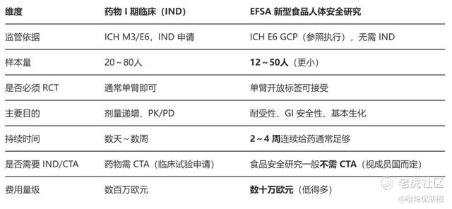 相比于药物的临床I期,EFSA新型食品人体安全研究样本量更小且接受单臂试验设计,无论是试验成本和随访时间都比药物临床I期都少得多。